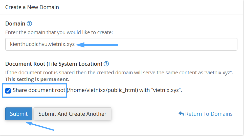 - Tạo một domain mới tại đây, và tại phần Document Root, bạn cần chọn Share document root. Sau đó, nhấn Submit để thực hiện việc tạo Alias Domain.