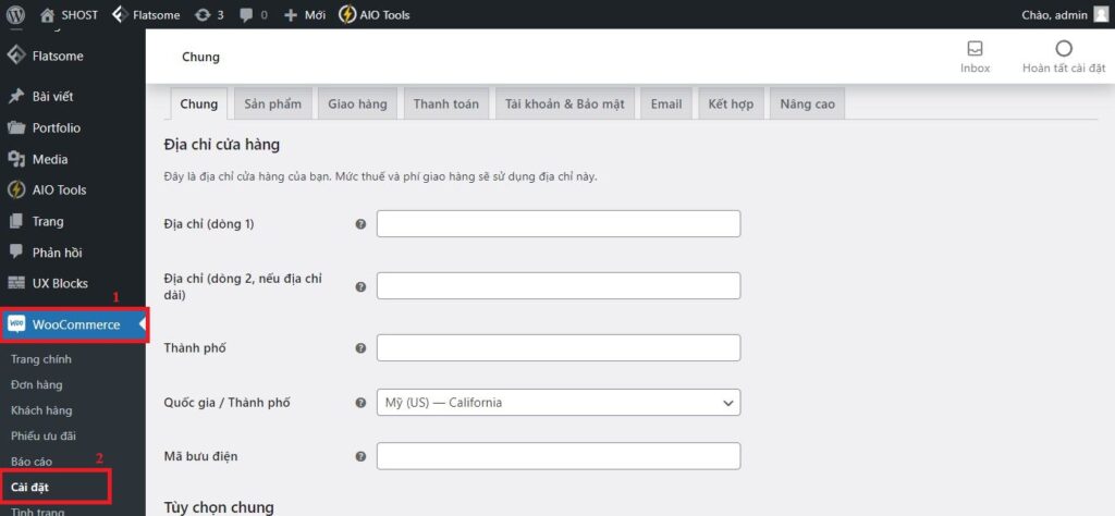 Bước 1: Đầu tiên, bạn truy cập vào trang cài đặt của WooCommerce bằng cách vào Admin Dashboard (bảng điều khiển quản trị). Tại đây, bạn chọn WooCommerce và tiếp tục nhấp vào phần Cài đặt để tiến hành cài đặt.