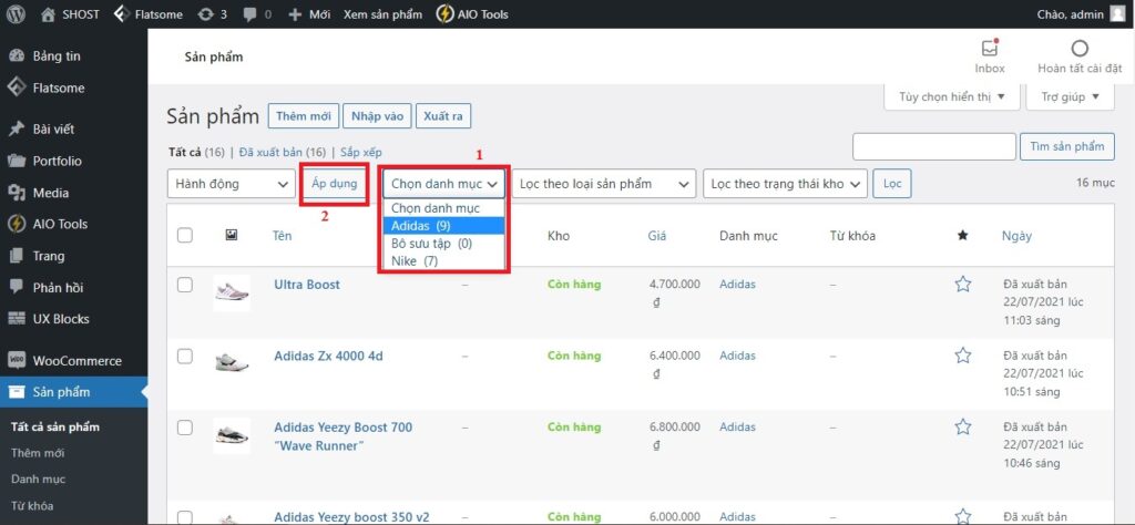 Bước 11: Tại đây, bạn sẽ được chuyển đến trang sản phẩm nơi hiển thị tất cả các sản phẩm của mình. Ví dụ, để áp dụng giao hàng miễn phí cho tất cả sản phẩm thuộc dòng Adidas, bạn hãy bấm vào Chọn danh mục, chọn Adidas, rồi nhấn nút Áp dụng.