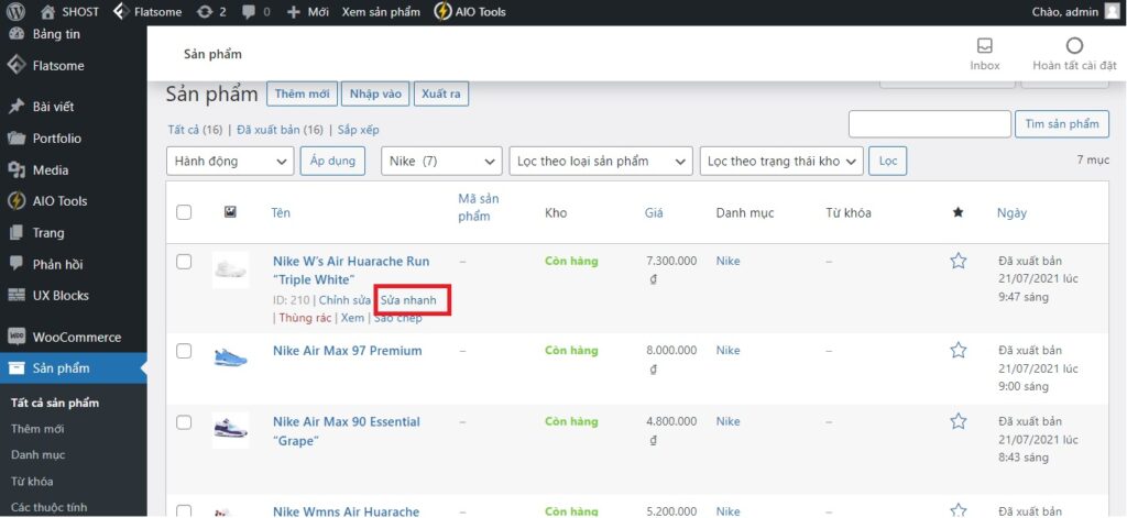 Bước 11: Chọn sản phẩm mà bạn muốn áp dụng miễn phí giao hàng, sau đó nhấn vào Sửa nhanh.