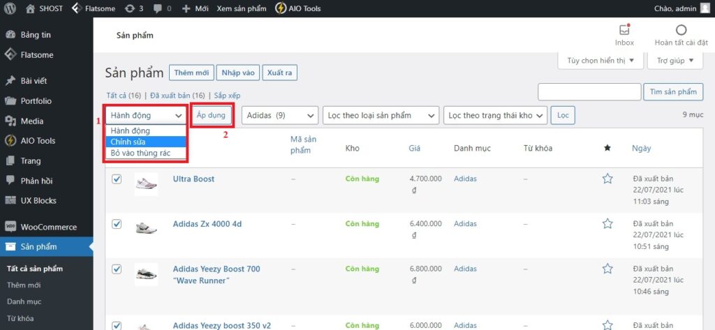 Bước 12: Sau đó, bạn sẽ thấy các sản phẩm thuộc dòng Adidas xuất hiện. Hãy chọn tất cả chúng, sau đó nhấn vào Hành động hàng loạt và chọn Chỉnh sửa. Tiếp theo, bấm nút Áp dụng.