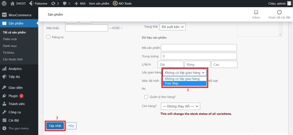 Bước 12: Trang sửa nhanh sẽ xuất hiện. Cuộn xuống và chọn từ danh sách thả xuống của Lớp giao, sau đó chọn giao hàng miễn phí và nhấn Cập nhật để kích hoạt.