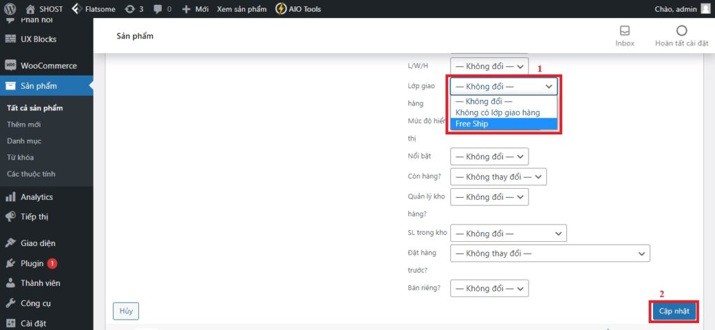 Bước 13: Trang chỉnh sửa hàng loạt hiện ra. Tại đây, nhấn vào danh sách thả xuống của Lớp giao, chọn giao hàng miễn phí và sau đó nhấn Cập nhật để kích hoạt.