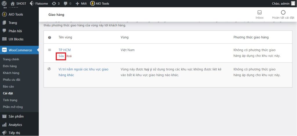 Bước 6: Khi trang khu vực giao hàng hiện lên, hãy di chuột đến vùng bạn muốn áp dụng miễn phí giao hàng và nhấn vào nút Sửa để thực hiện chỉnh sửa.
