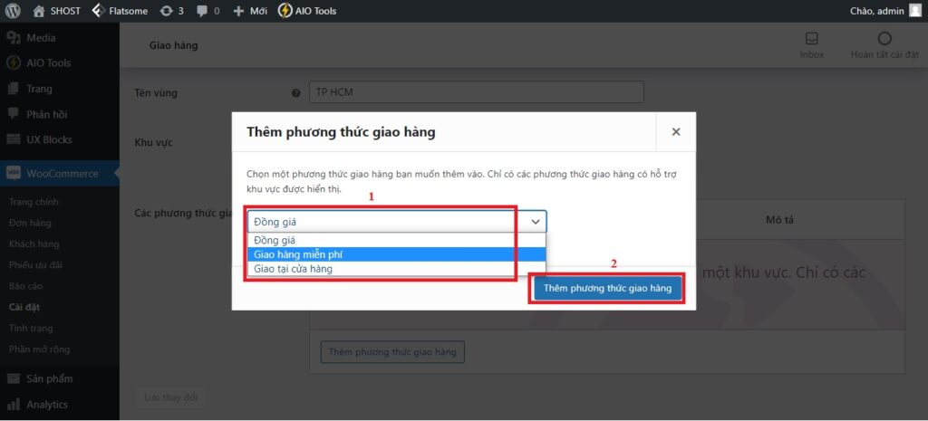Bước 8: Khi cửa sổ thêm phương thức giao hàng xuất hiện, bạn hãy chọn Giao hàng miễn phí từ trình đơn thả xuống, sau đó nhấp vào Thêm phương thức giao hàng.