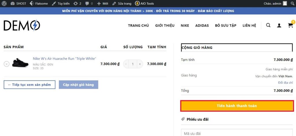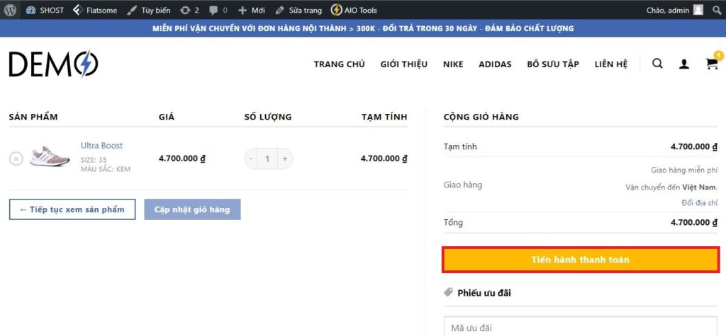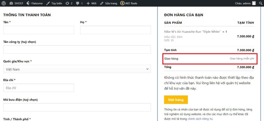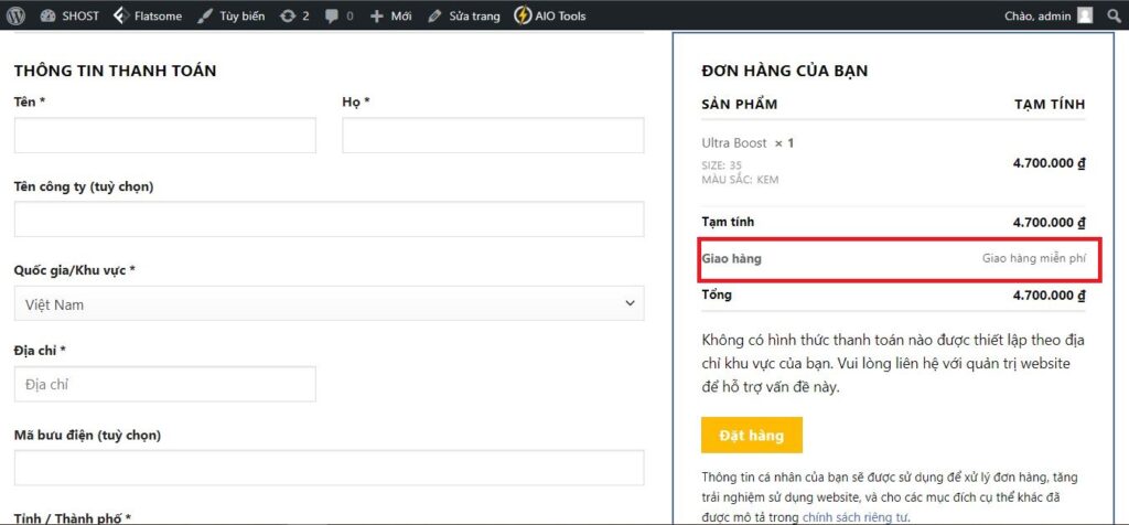Bây giờ, nếu bạn thêm sản phẩm này vào giỏ hàng và tiến hành thanh toán, bạn sẽ nhận thấy rằng sản phẩm này đã được miễn phí vận chuyển.