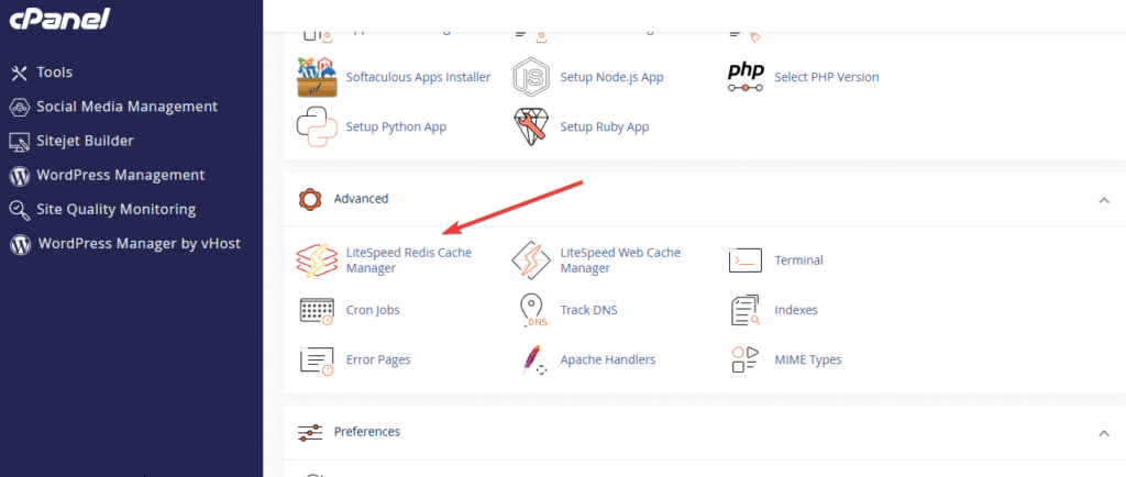 Trên giao diện quản trị cPanel, bạn có thể dễ dàng tìm thấy công cụ LiteSpeed Redis Cache Manager nằm trong nhóm tính năng Advanced.