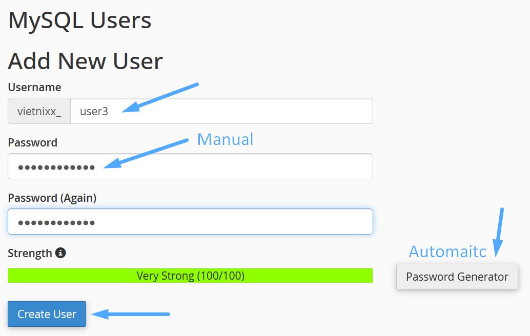 Tại phần Add New User, quý khách điền username và password. Sau đó nhấn Create User.