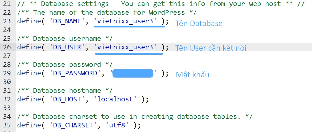 Bước 7: Thực hiện cấu hình trong file kết nối Database với thông tin database, user, password đã tạo.