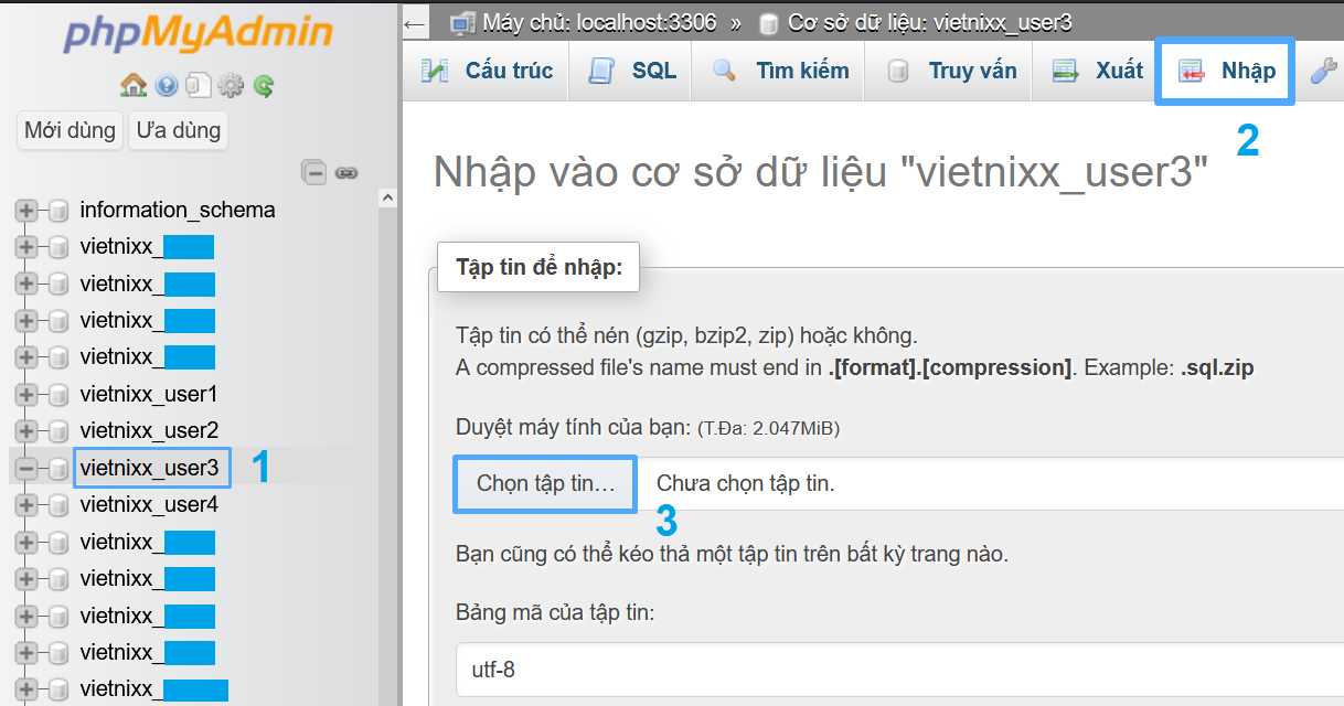 - Chọn database vừa tạo > chọn tab Nhập > chọn Choose File.